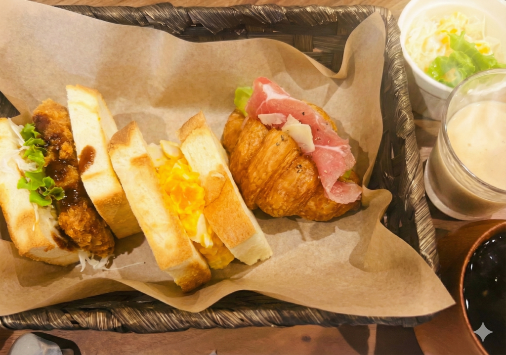 (コロッケサンド・半熟玉子サンド・HLTサンド・クロワッサン+サラダ+ドリング)